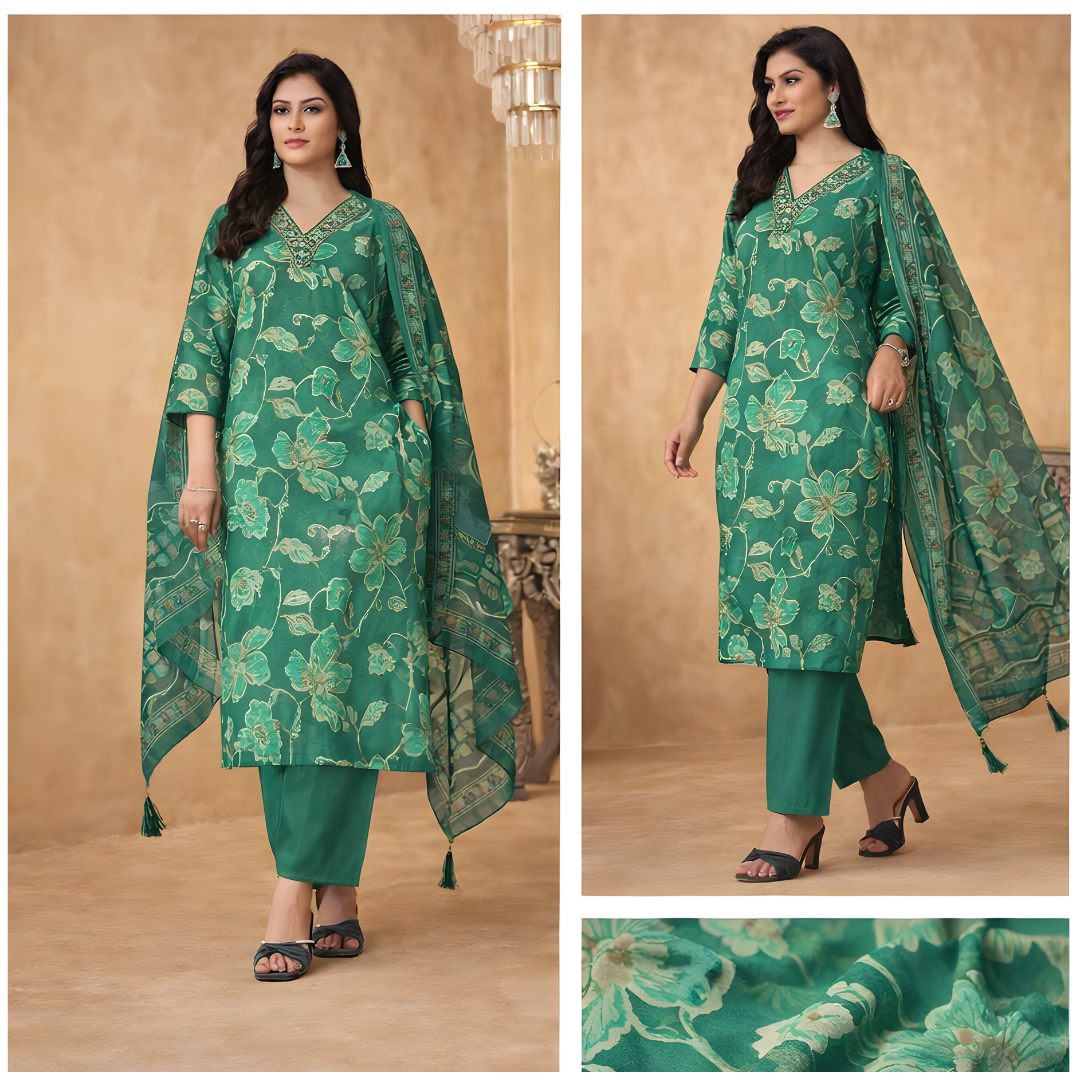 The kurta is crafted from premium Vatican silk, offering the rich appearance of silk with the breathable comfort of viscose. Its straight silhouette is enhanced with a flattering V-neckline, detailed yoke placement, and intricate thread work that adds a subtle festive sparkle. The floral digital print remains vibrant and elegant, while the 3/4 extended sleeves complete the refined design. Paired with comfortable rayon trousers and a lightweight cotton silk dupatta, this set ensures a polished look without compromising on comfort.